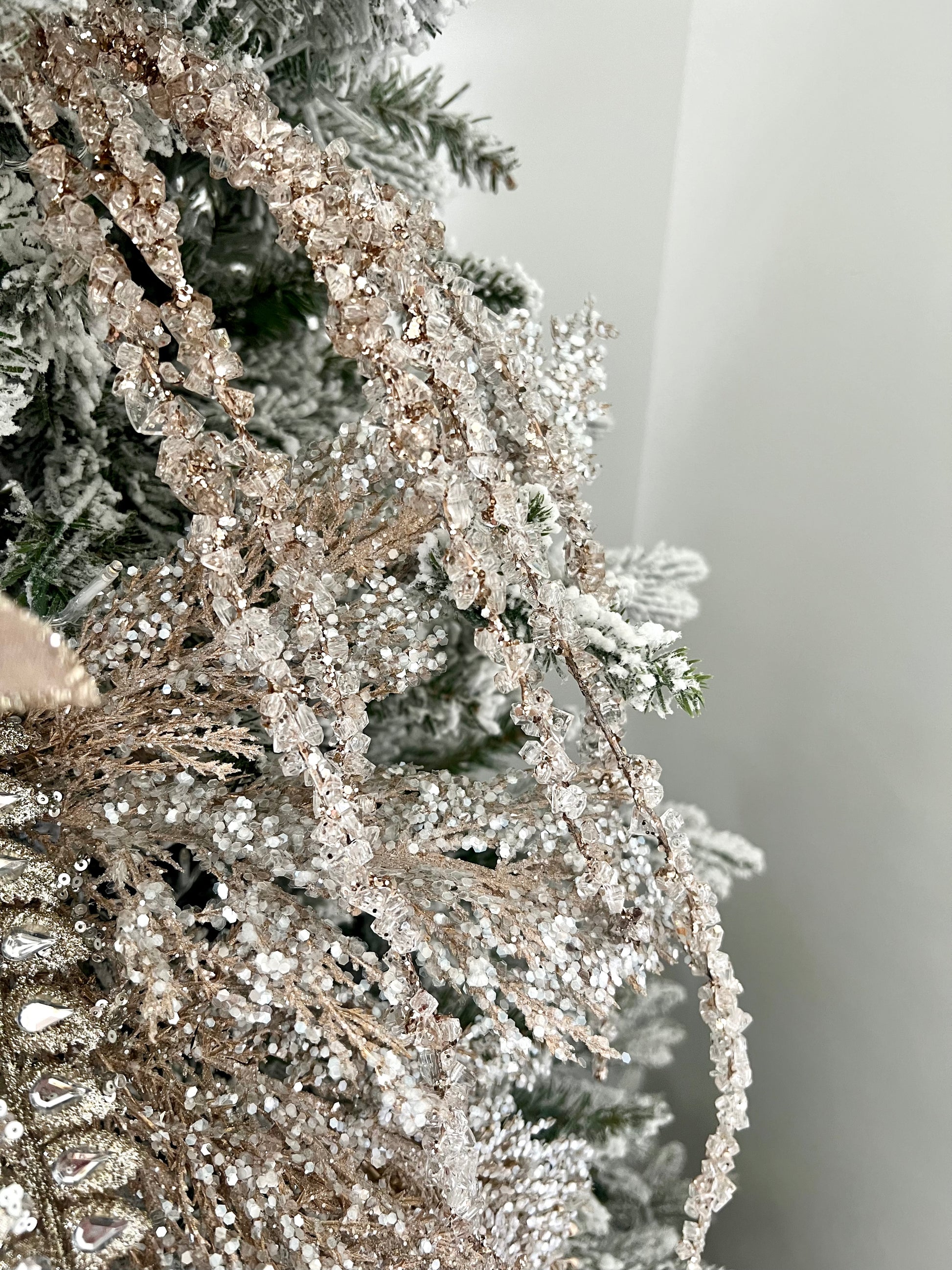 Introducing our Best Selling 36" Champagne Hanging Iced Branch - the perfect way to sparkle up your Christmas decorations! Get creative and cascade this beauty over your tree with its 5 sparkling, icy stems. This festive favorite will have you feeling champagne-level glam this holiday season!