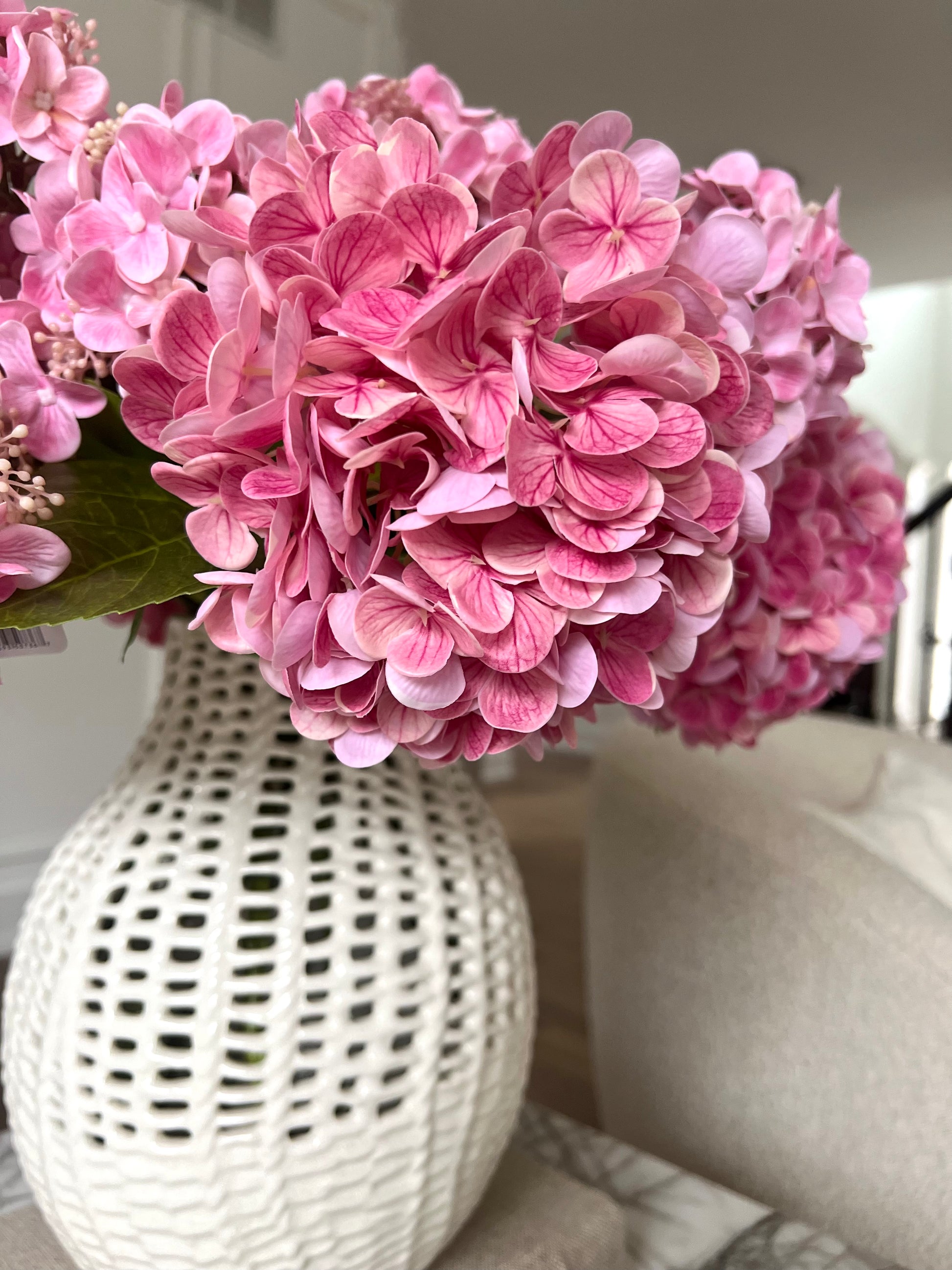 Arrangement shown with 8 Pink Real Touch Hydrangea stems and 8 Pink Hydrangea sprays