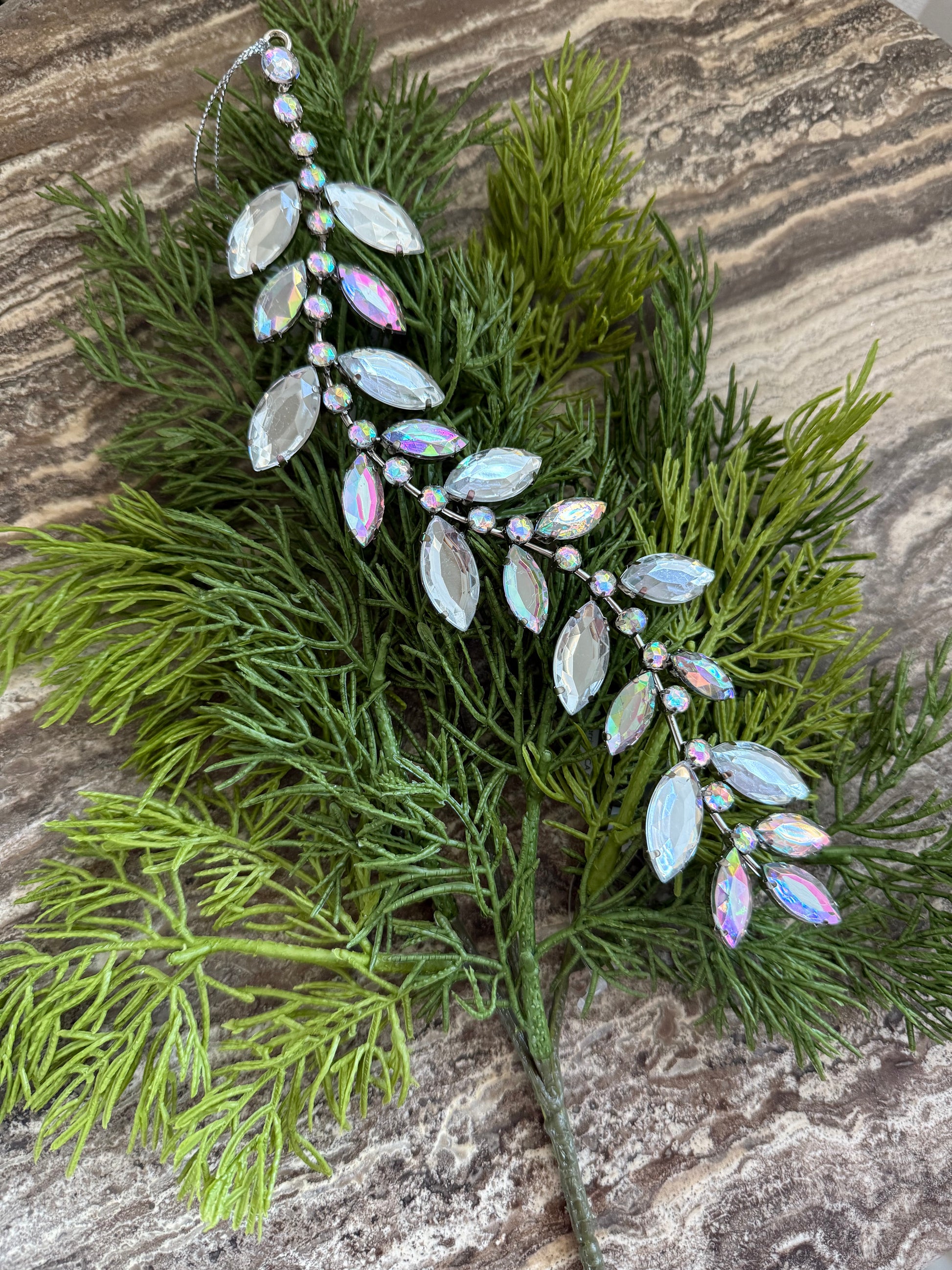 Add a touch of elegance with this 8.5" rhinestone leaf drop ornament. Its intricate design and shimmering rhinestones create a sophisticated sparkle, perfect for enhancing your holiday décor with graceful refinement and understated luxury.