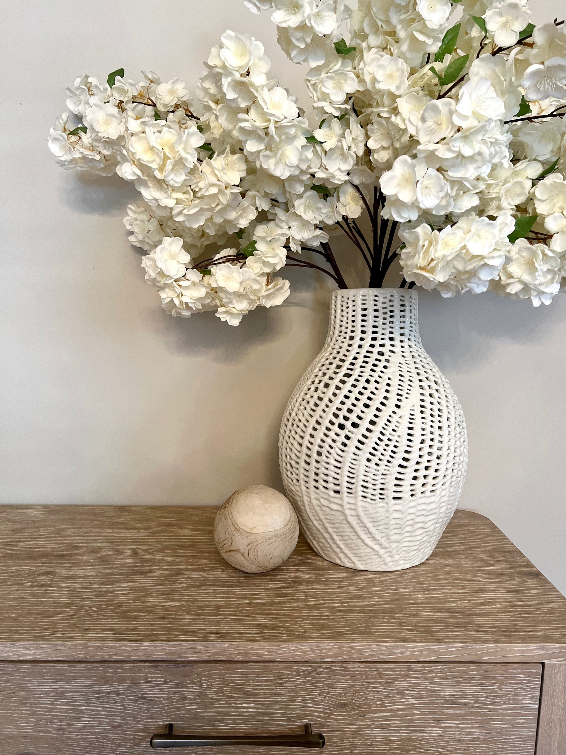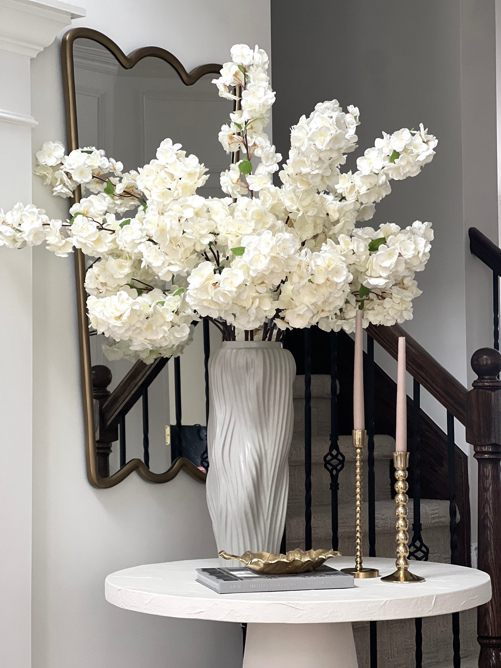 Cherry Blossoms are one of our favorite spring florals. This spray features full bloom creamy white cherry blossoms and stands approximately 44” H. It is a statement making floral that is sure to impress. The arrangement as shown contains 7 spray. Sold as one 44" spray.